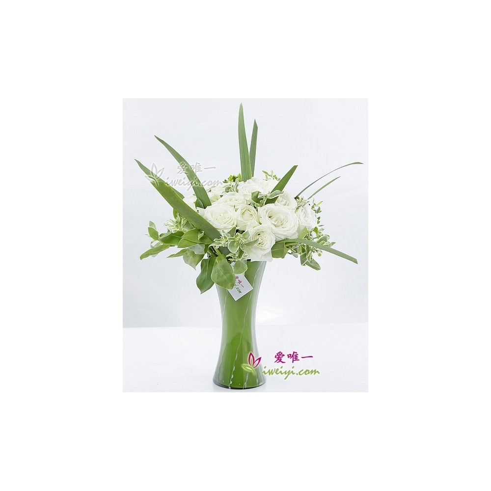 16 朵優質白玫瑰,點綴著大戟屬植物和鳶尾花葉簇,插在花瓶中。