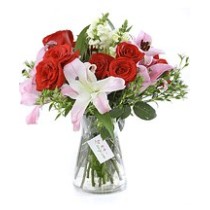 Jarrón de vidrio compuesto por 12 rosas rojas frescas, 2 lirios perfumados blancos de múltiples tallos y 2 lirios perfumados rosas de múltiples tallos.