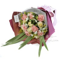 फूलों का गुलदस्ता जिसमें 6 शैम्पेन गुलाब तथा 8 गुलाबी कारनेशन, सफेद पिनाथस जैपोनिकस और सोलिडागो डेकुरेंस शामिल हैं।
