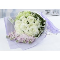 फूल: 3 नीले हाइड्रेंजिया, 19 सफेद गुलाब, 2 बहु-सिर वाली सफेद लिली, सफेद लिसिएंथस और युकलिप्टस।