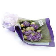 सफेद सूती कागज, बैंगनी क्रेप कागज से निर्मित उत्तम आवरण, तथा बकाइन रिबन से सजा हुआ।