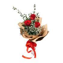 3 लाल गुलाब, जिप्सोफिला और हरी पत्तियां।
