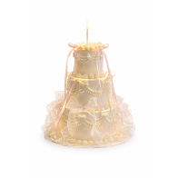 Bolo com acabamento em buttercream cor marfim, laços delicados, acabamento em viés drapeado e um suporte alto para vela (os acessórios podem variar).