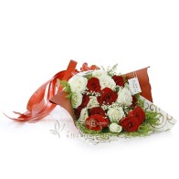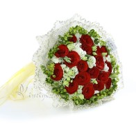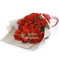 16 rosas vermelhas de primeira qualidade e 14 cravos vermelhos, com detalhes em folhagem fresca.