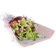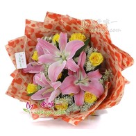 Este buquê de rosas amarelas e lírios cor-de-rosa pode ser entregue em qualquer lugar da China, incluindo Hong Kong, Macau e Taiwan.