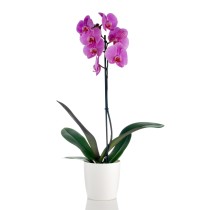 Orquídea Phalaenopsis roxa, plantada em vaso.