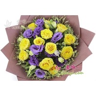 12 朵優質黃玫瑰,點綴著紫色洋桔梗、水晶草和新鮮綠葉。