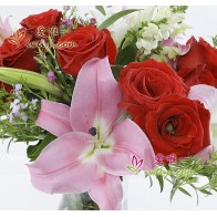 玻璃花瓶,由 12 朵新鲜红玫瑰、2 朵多茎白色香水百合和 2 朵多茎粉红色香水百合组成。