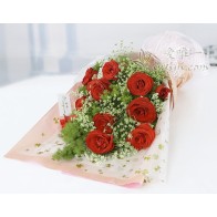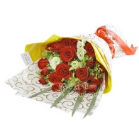 花材:12枝红玫瑰,蓬莱松间插,蕾丝丰满。